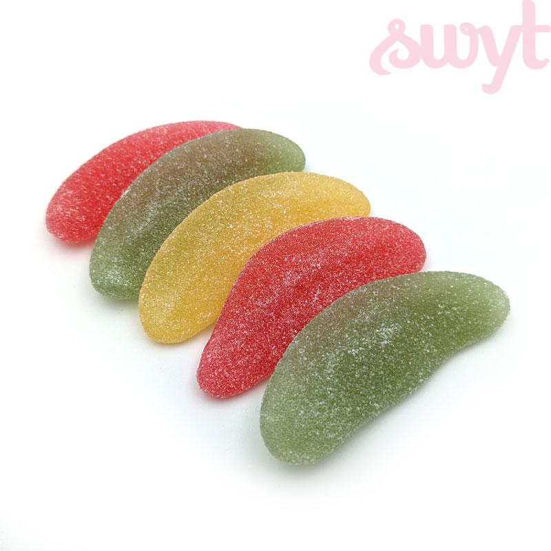 Haribo zure bommen zijn fruitige schijfjes met een zuur laagje.