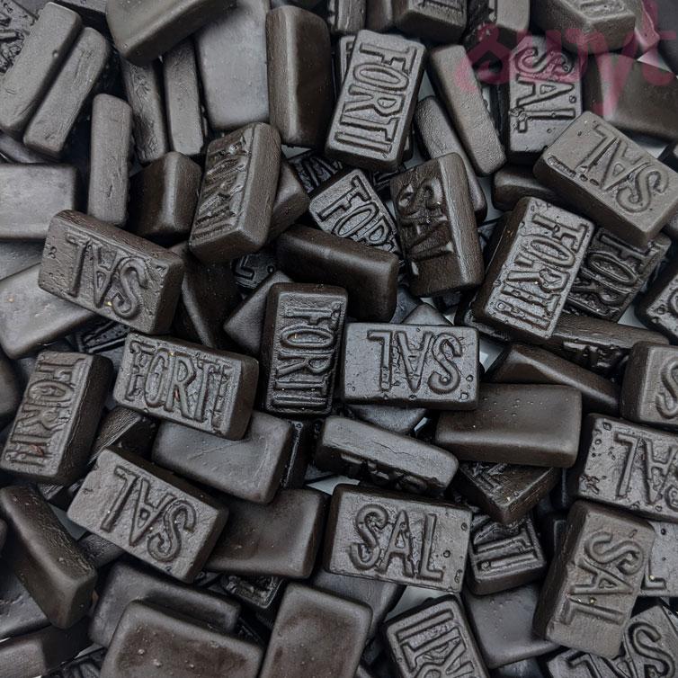 Een stevig dubbel zout dropje met de woorden Forti (sterk) en Sal (zout).